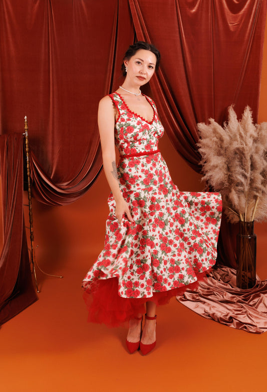 CHERRIE 3-Piece Set with Floral Pattern with Red Flowers and Tulle Under Skirt