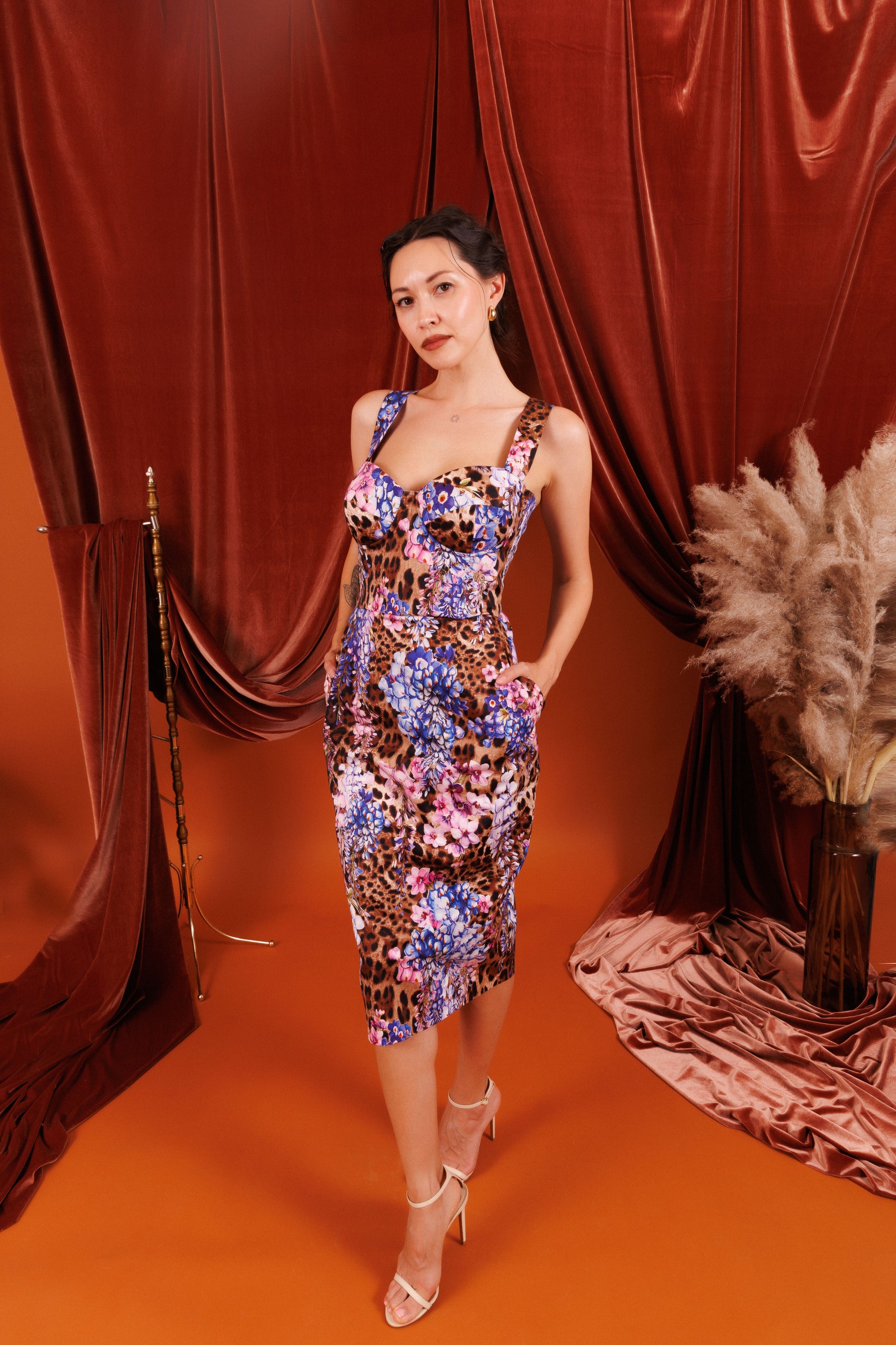 Make a bold statement with the Bianca Midi Dress, featuring a striking multicolor animal print with violet accents. This dress combines style and functionality with its chic pencil skirt design and practical pockets. Crafted from a comfortable blend of 93% cotton and 7% lycra, with a luxurious 100% silk charmeuse lining, the Bianca Midi Dress offers a flattering fit and a touch of elegance.