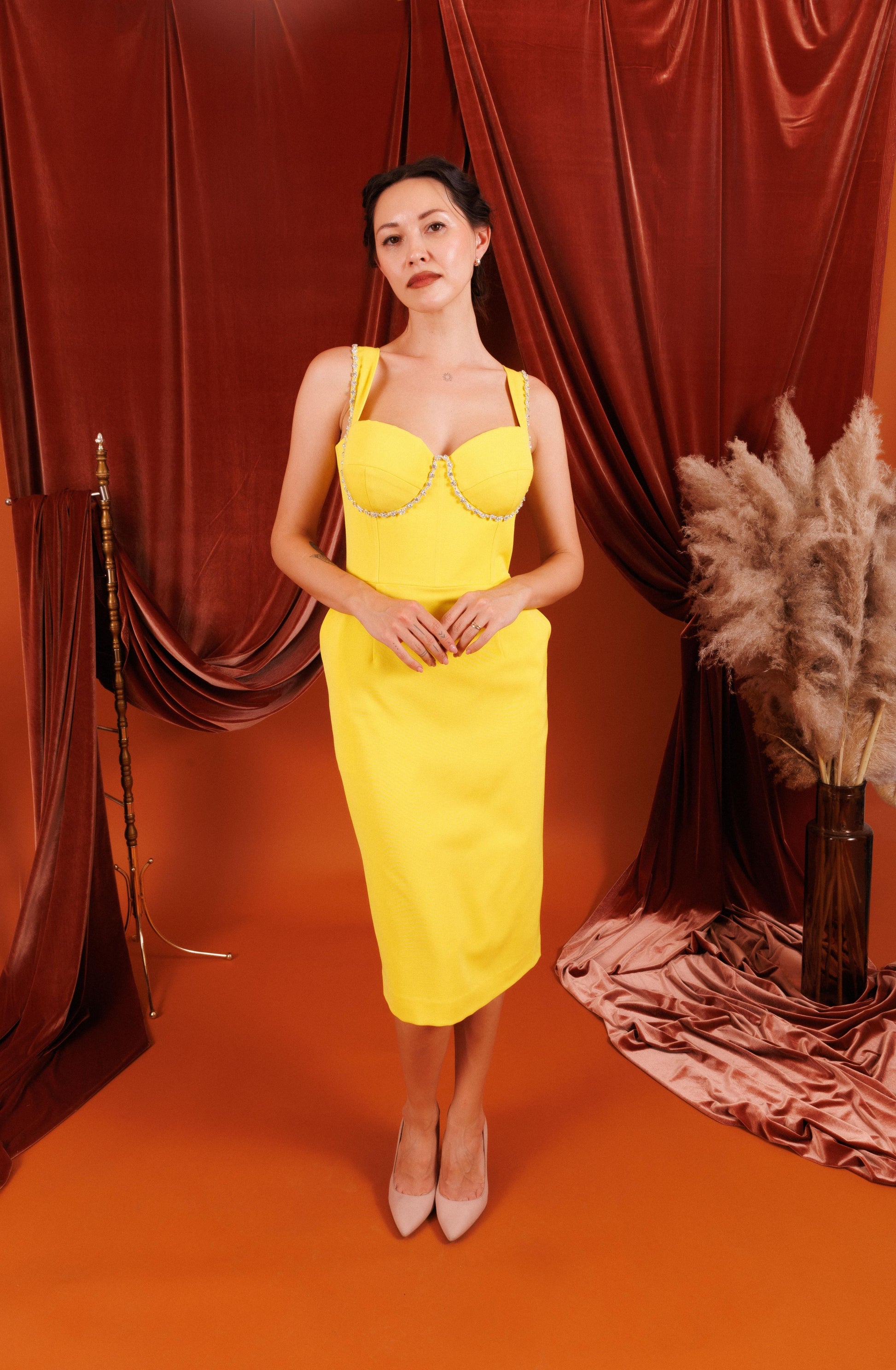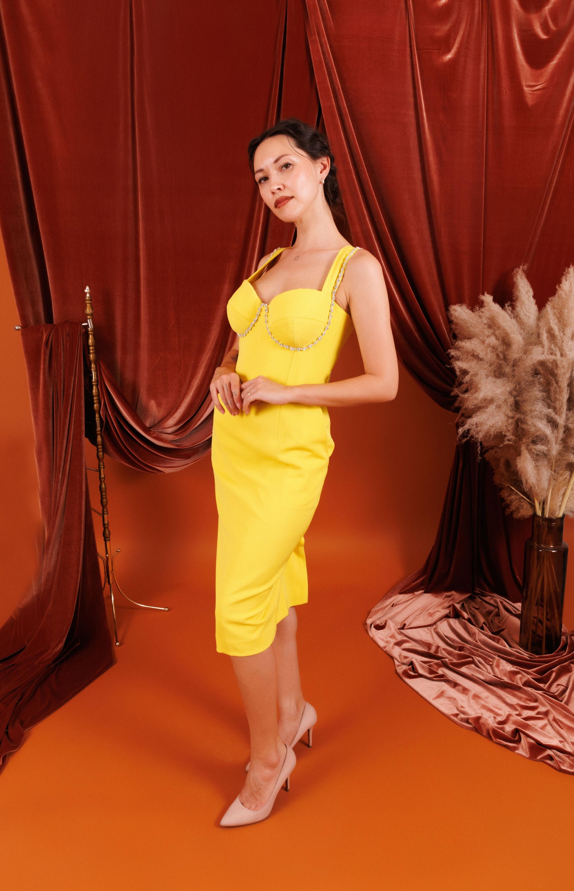 BIANCA Midi Dress with Pencil Skirt and Pockets in Yellow with Crystals