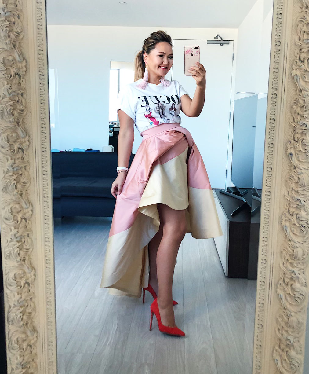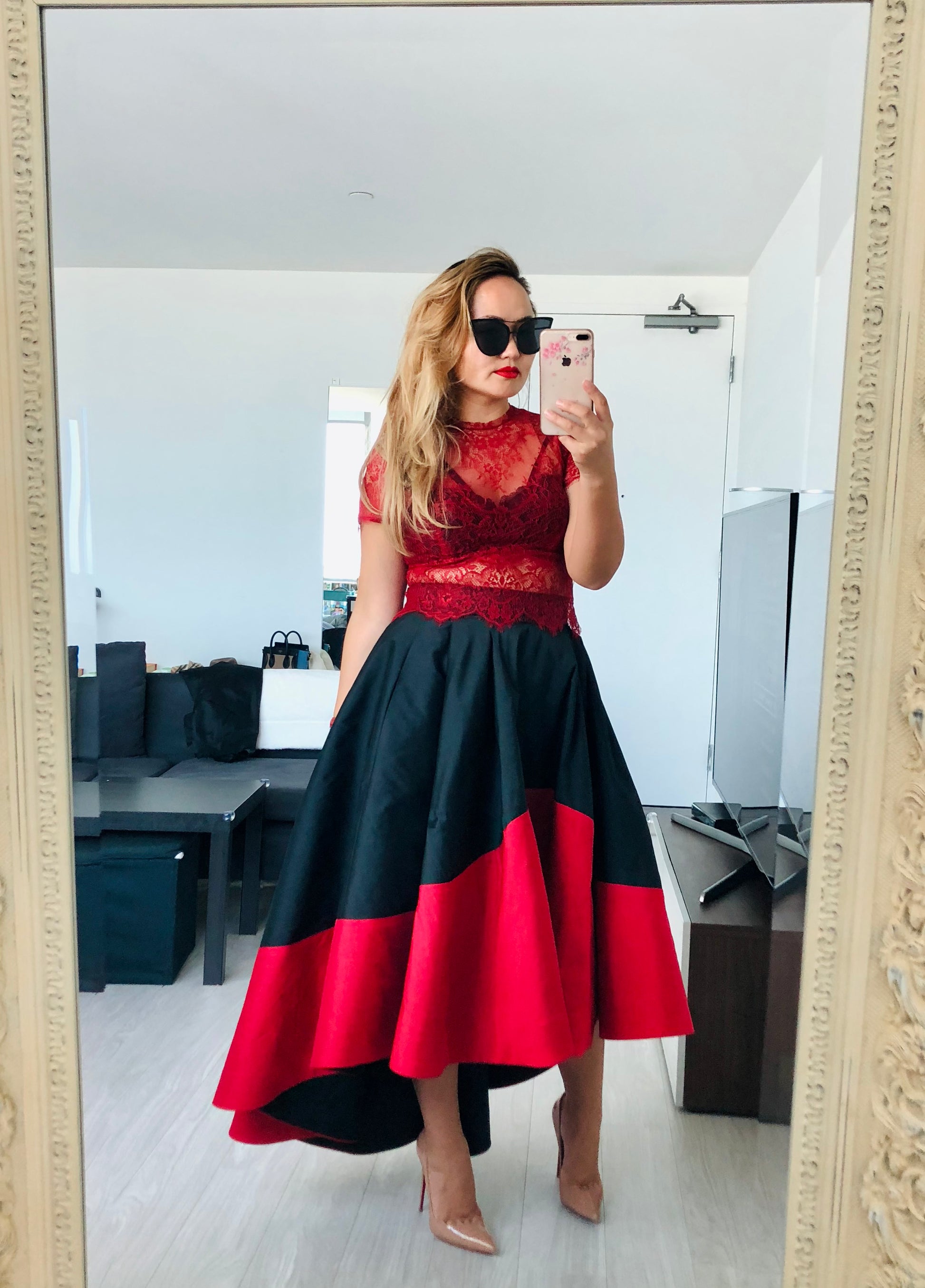 The Carrie High-Low Skirt can be worn in multiple ways. Use the hidden buttons and hooks to bustle up the skirt, transforming it from a classic high-low silhouette to something uniquely beautiful and outstanding. Perfect for dressing up for an event or adding a stylish flair to your everyday look, this skirt combines functionality and high fashion, making you feel like you're walking the streets of New York City.