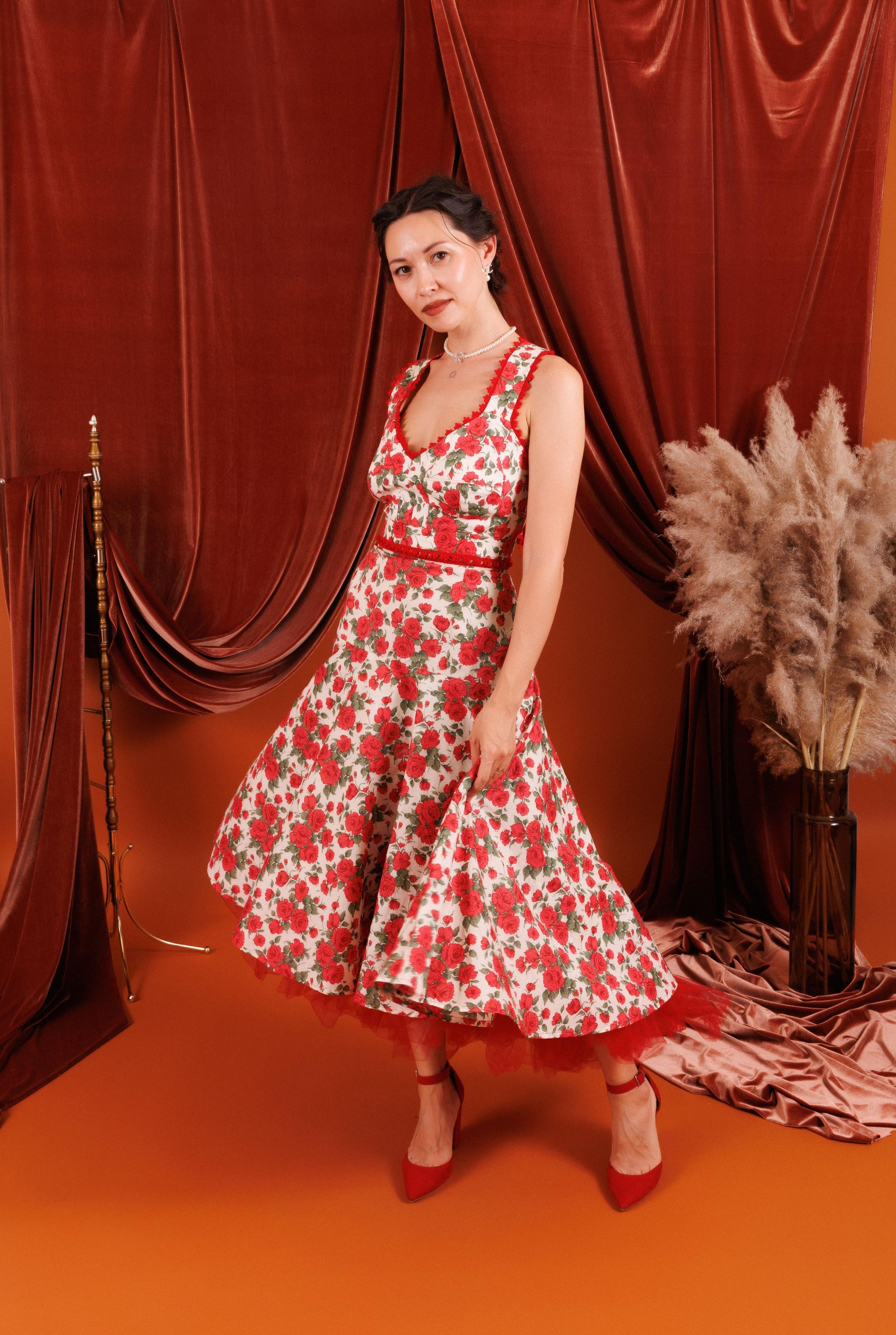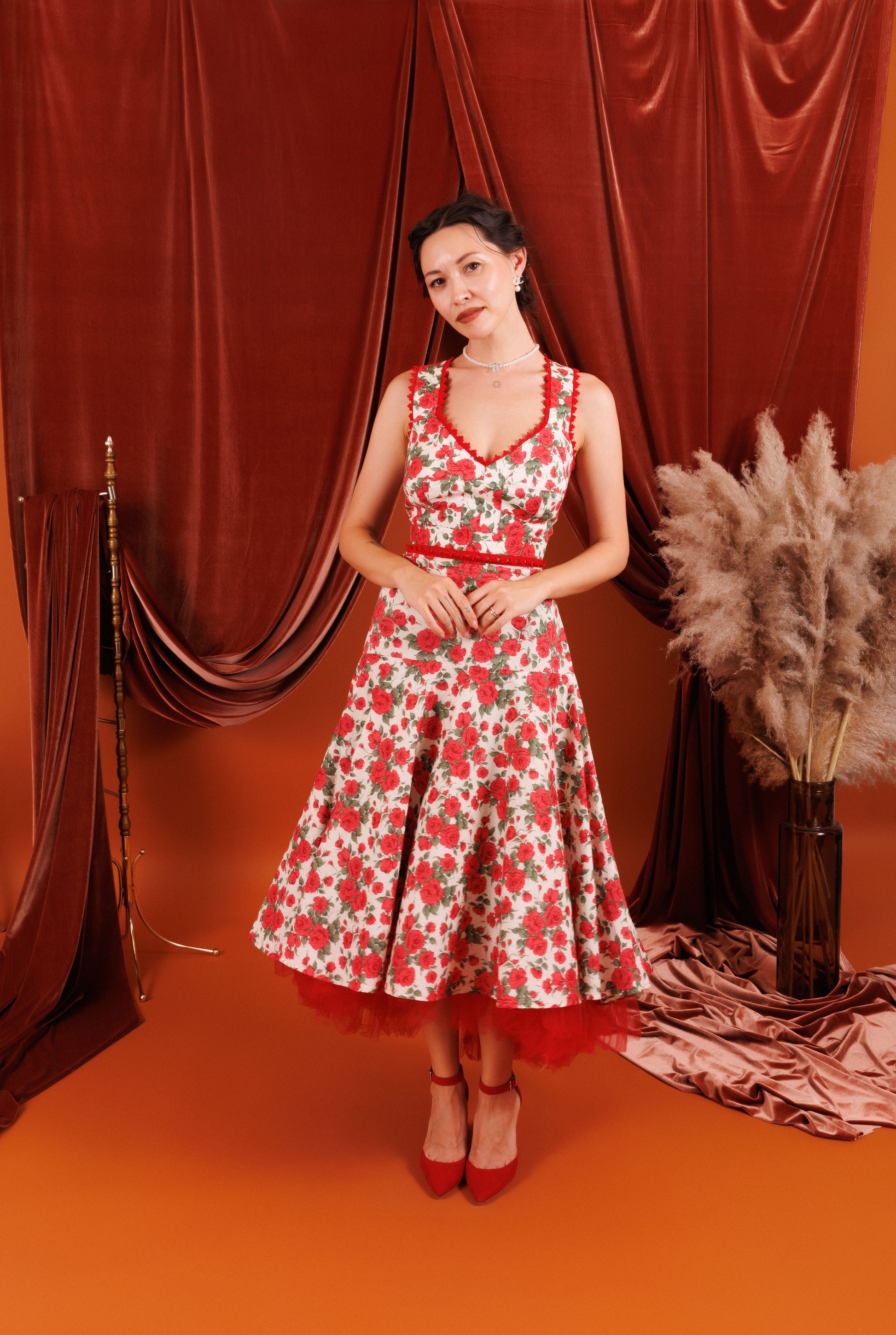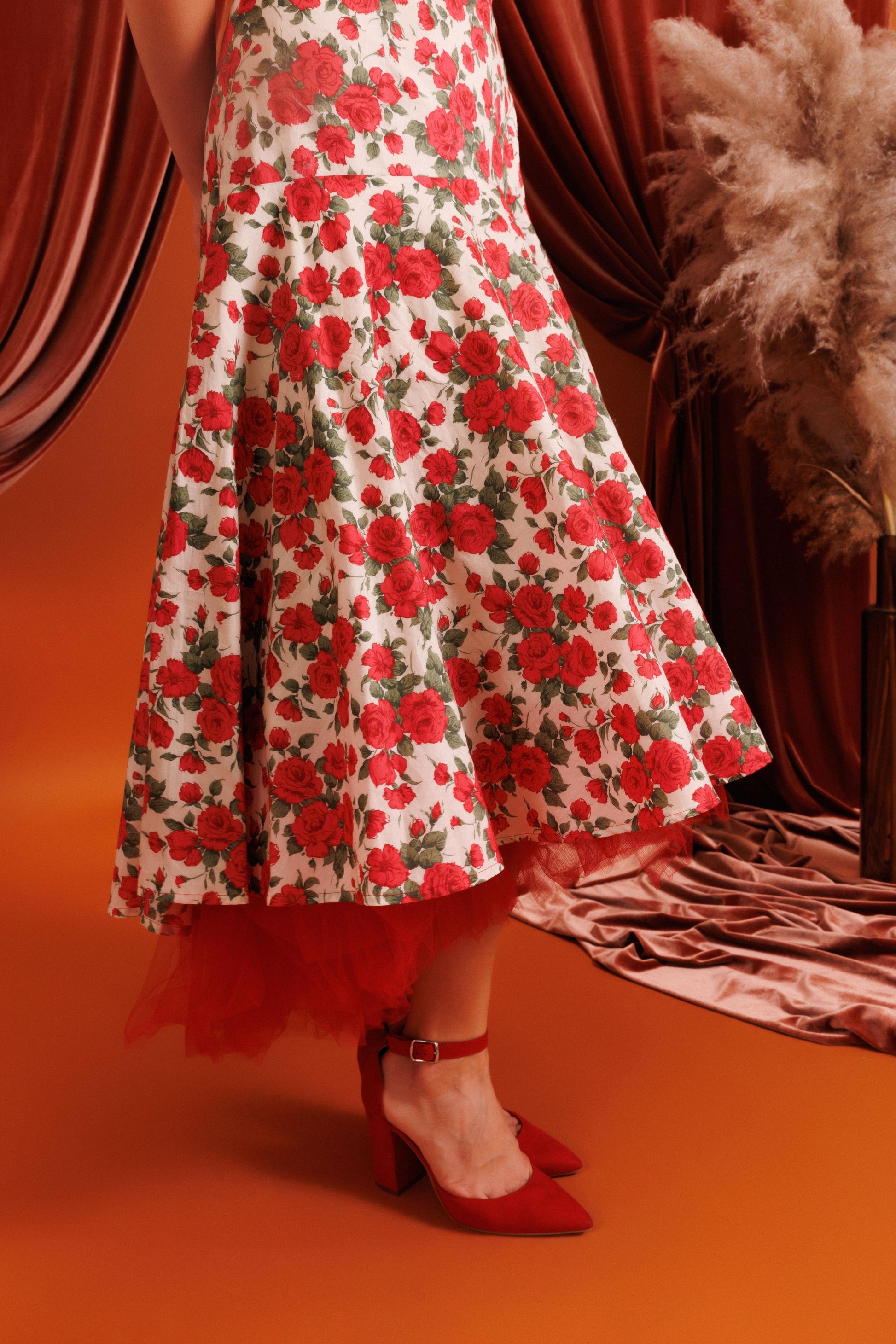 CHERRIE 3-Piece Set with Floral Pattern with Red Flowers and Tulle Under Skirt