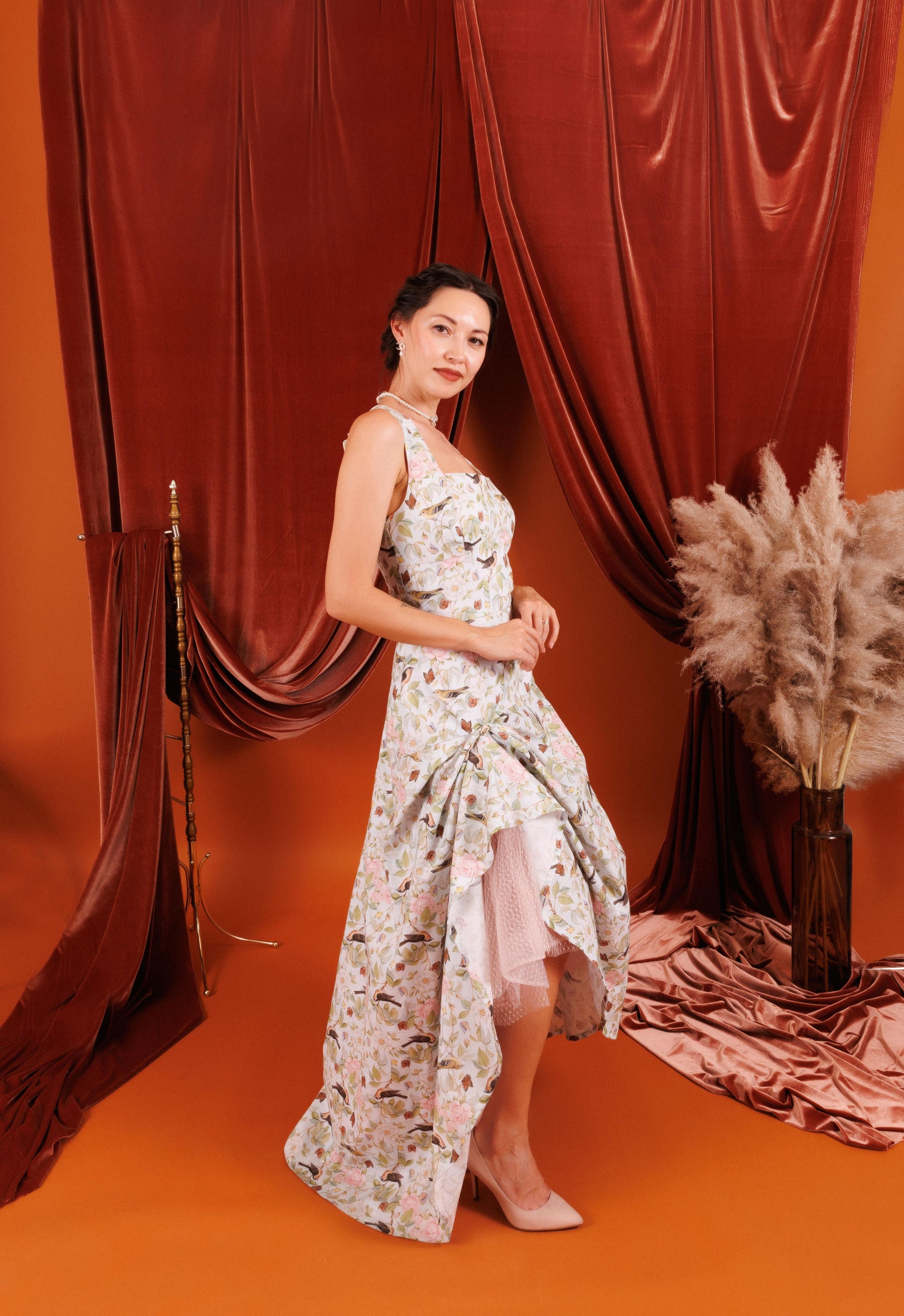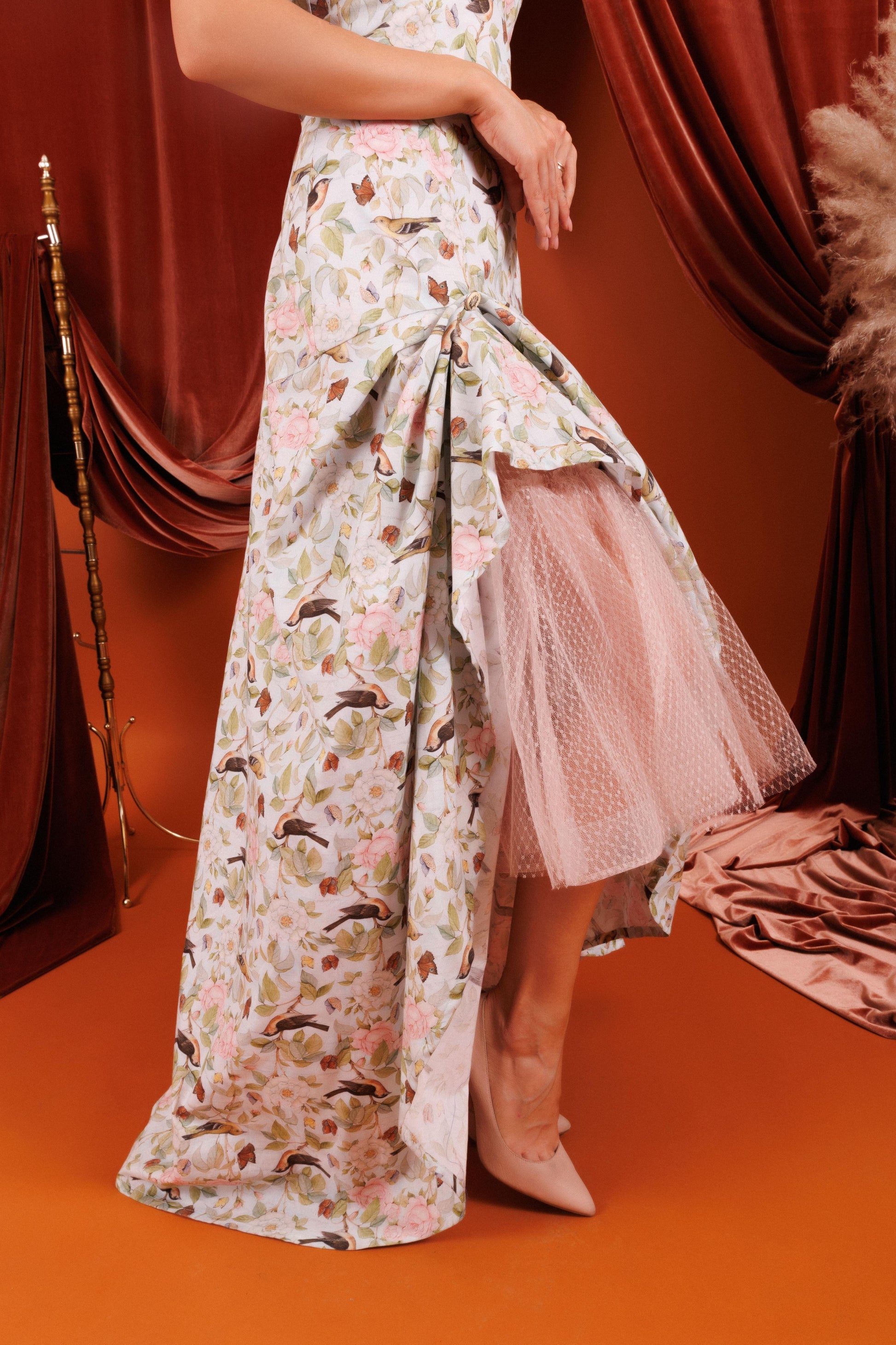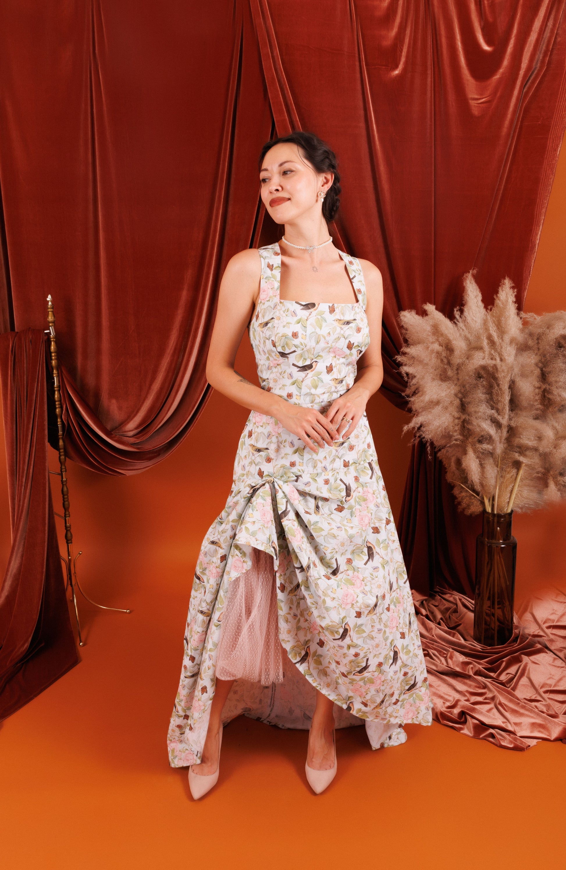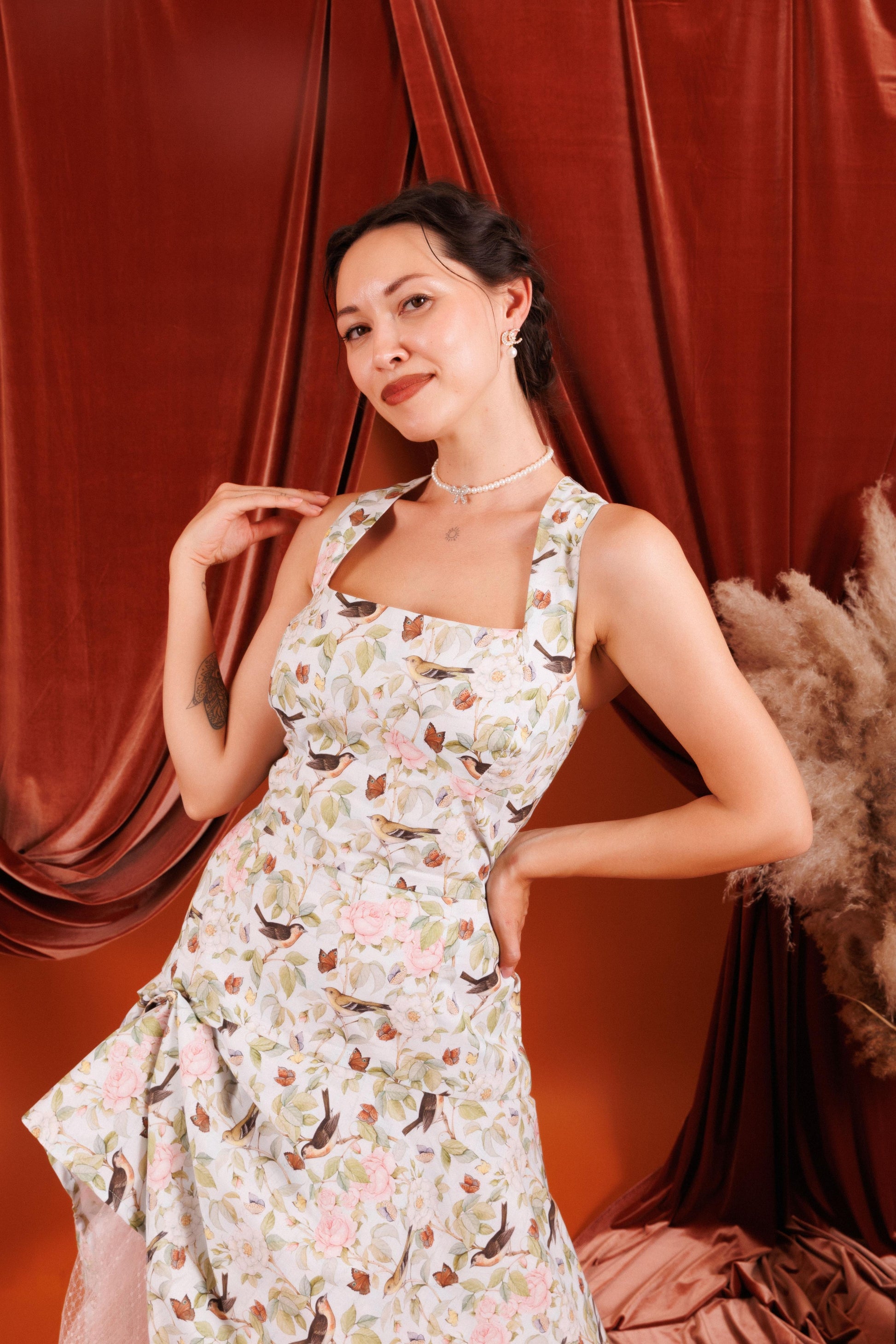 Step into a romantic novel with the Elda Maxi Dress, a perfect embodiment of grace and elegance. This sleeveless dress features a beautiful floral pattern adorned with butterflies and birds, evoking warmth and sophistication. Crafted from 100% cotton, the Elda Maxi Dress is ideal for summer strolls, picnics, and more. Its slightly voluminous skirt adds a festive touch, complemented by a tasteful slit that adds a hint of allure to your look.