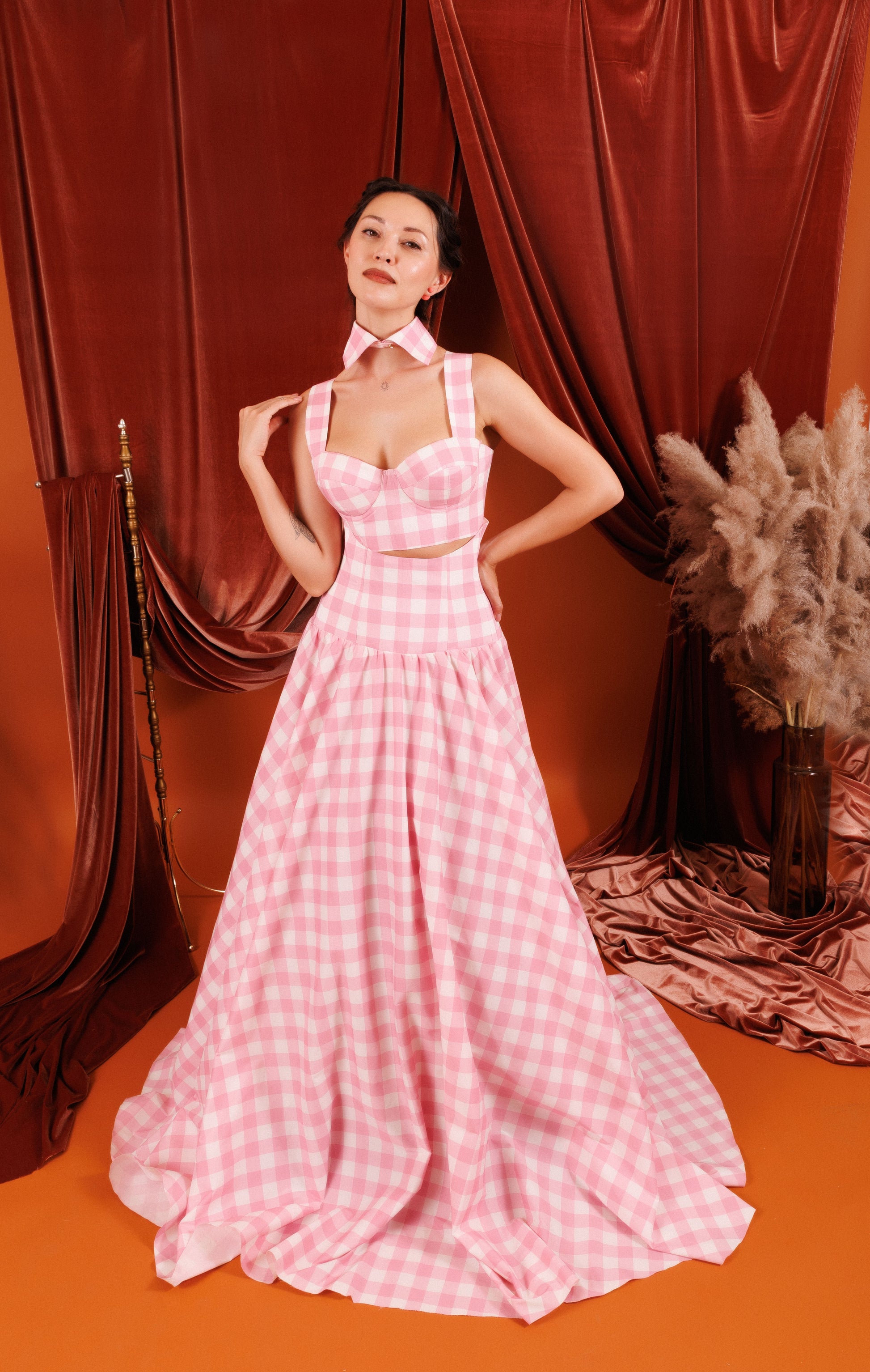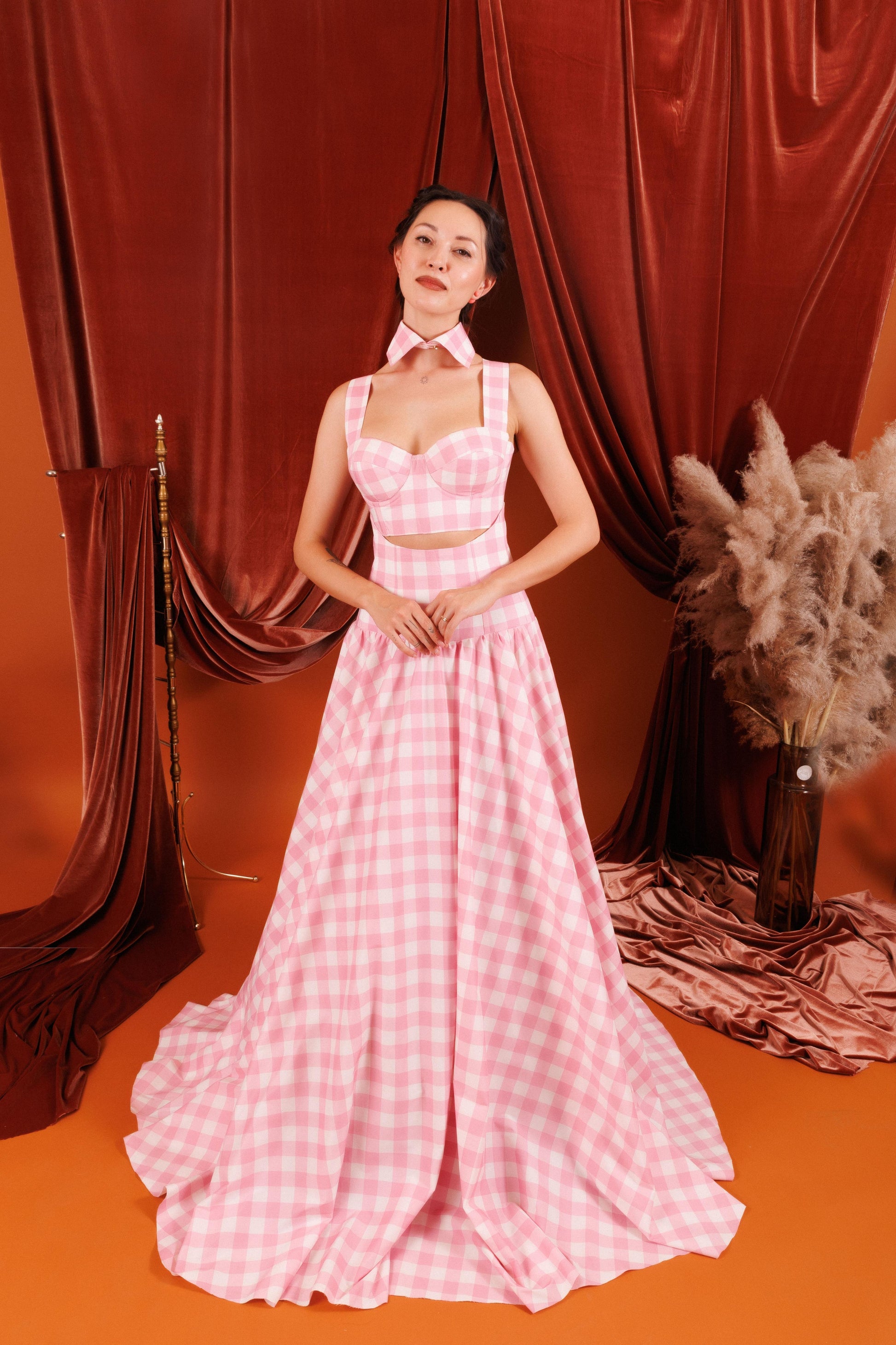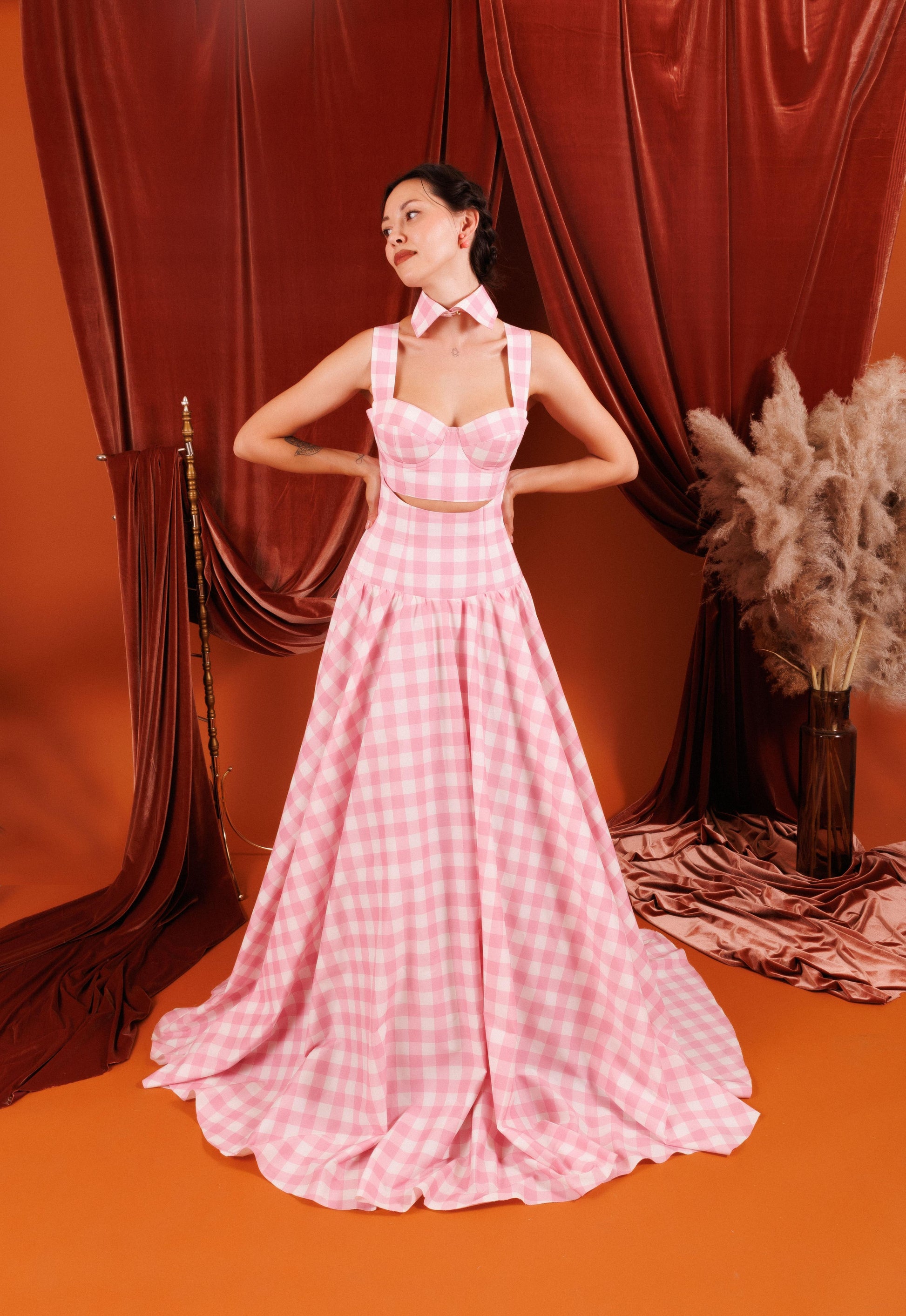 Embrace the chic country style with the Emma Maxi 3-Piece Set, a stunning ensemble in light pink with a bold square pattern. This versatile set includes a collared crop top, a flowing gown skirt, and a corseted belt at the waistline. Designed to perfectly accentuate your figure and create a memorable look, the Emma Maxi Set combines elegance and playfulness in a unique and stylish way. Ideal for any occasion, this 3-piece set ensures you stand out with its charming and sophisticated design.