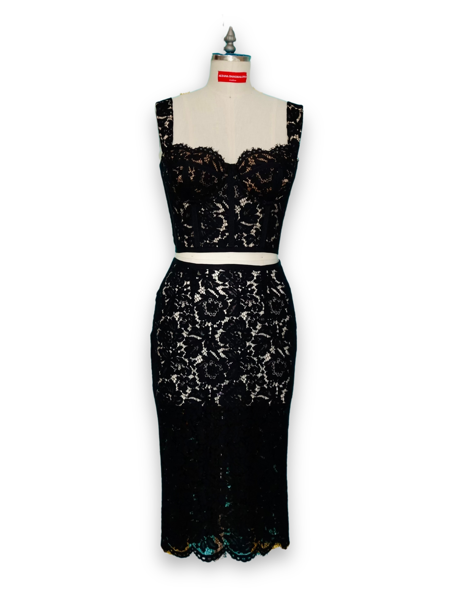 Make a statement with the luxurious Gia French Lace Set, featuring a sleeveless top and a pencil skirt. Crafted from 100% cotton cord French lace, this stunning set is designed to make you the center of attention at any event. The elegant black lace offers a timeless look that can also be worn separately for everyday sophistication. Perfect for special occasions or elevating your daily style, the Gia Set combines versatility with high fashion.