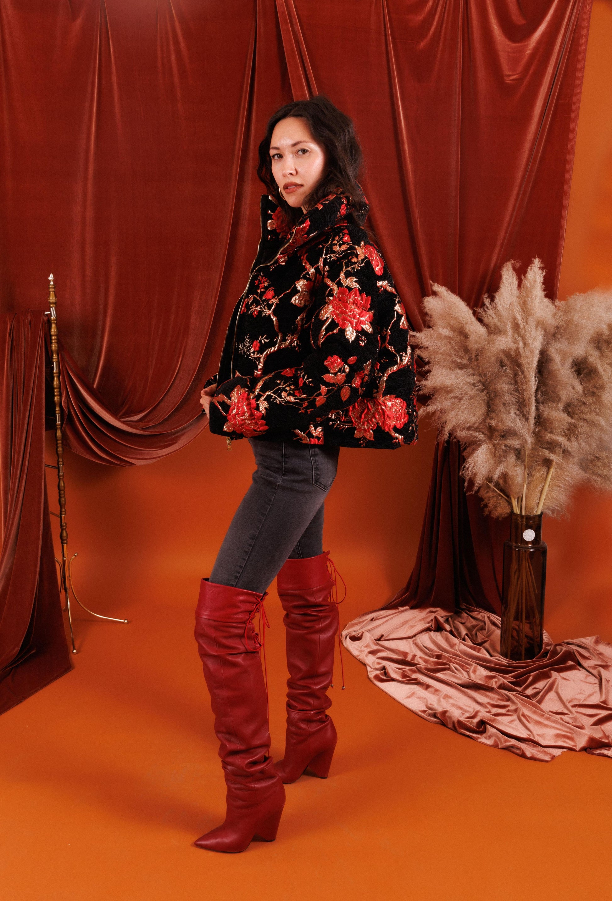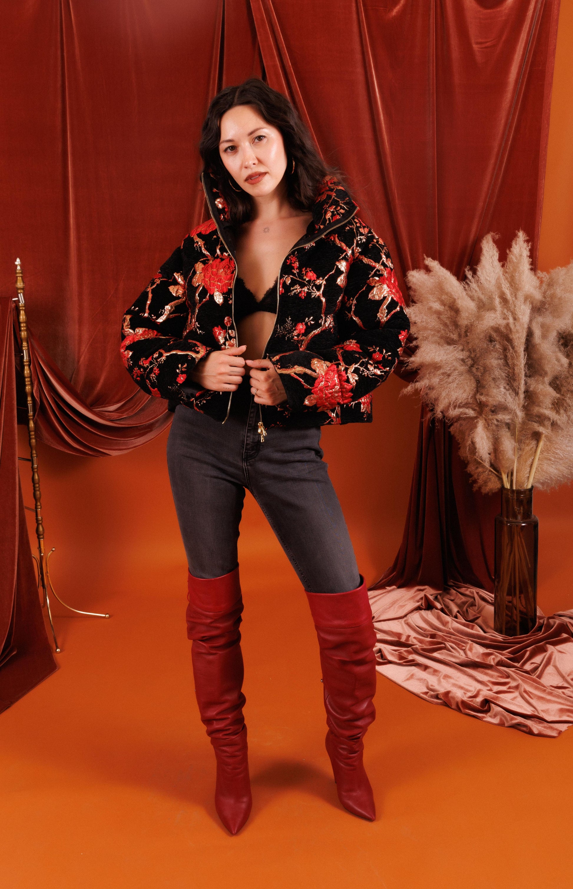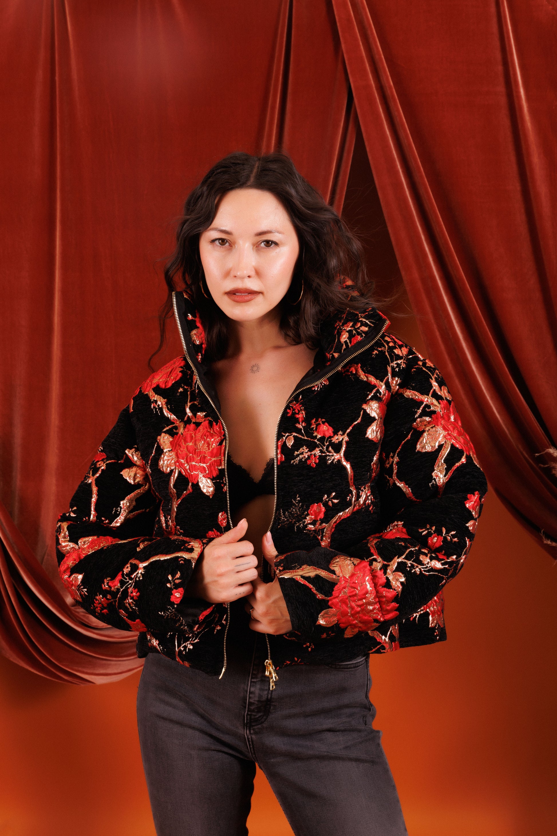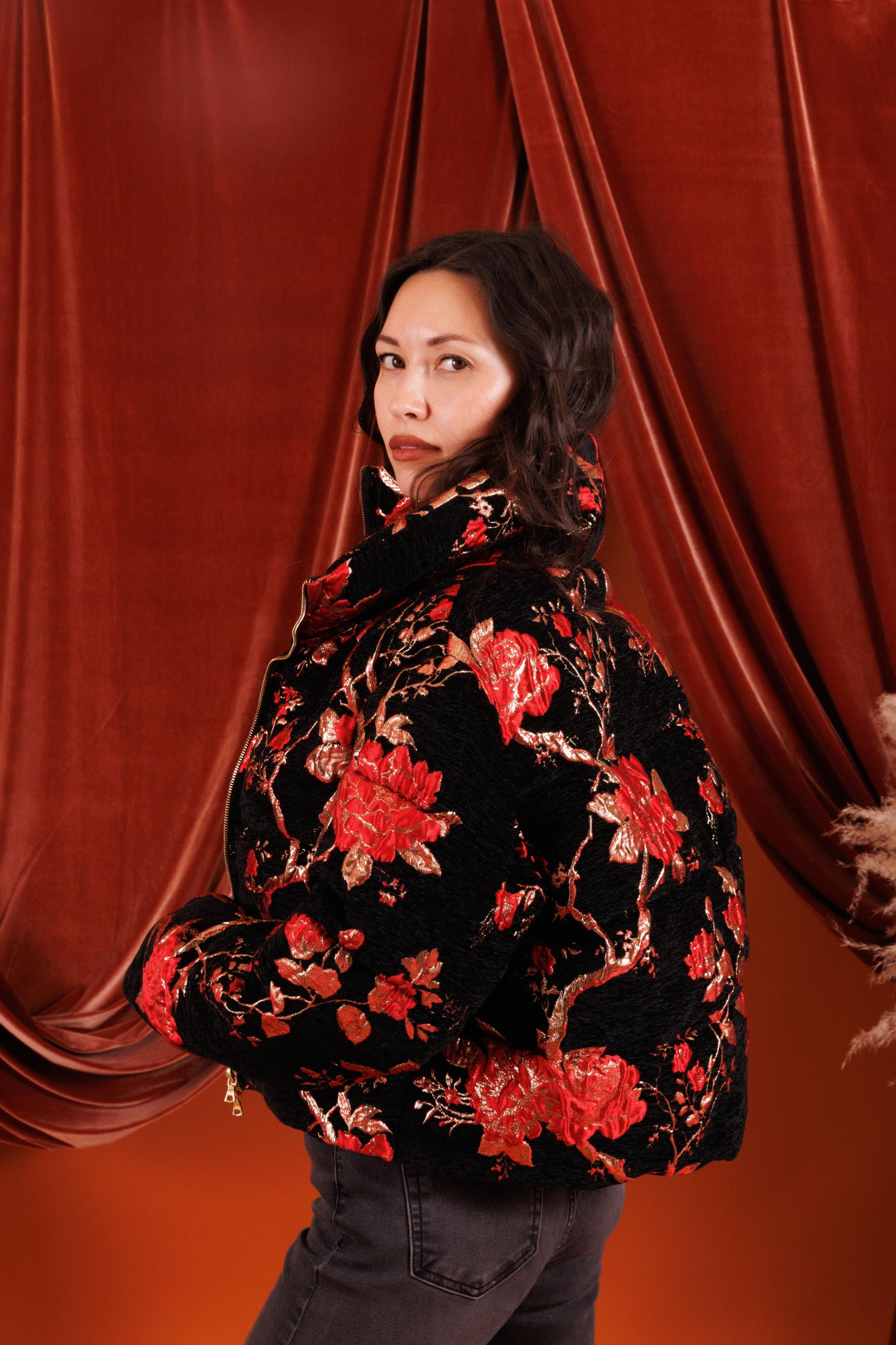 Step out in style this winter with the Gianna Mini Puffer. This elegant outerwear piece boasts a striking black brocade fabric adorned with vibrant red flowers and accented with gold thread for a touch of opulence. Made from a blend of 93% brocade and 7% metallic fibers, it provides a rich texture and a subtle sheen. The interior polyester lining ensures warmth and comfort, making it perfect for cold days in the city. The Gianna Puffer's mini length and long sleeves create a trendy silhouette that pairs beautifully with both casual and evening outfits, adding a layer of sophistication to any look.