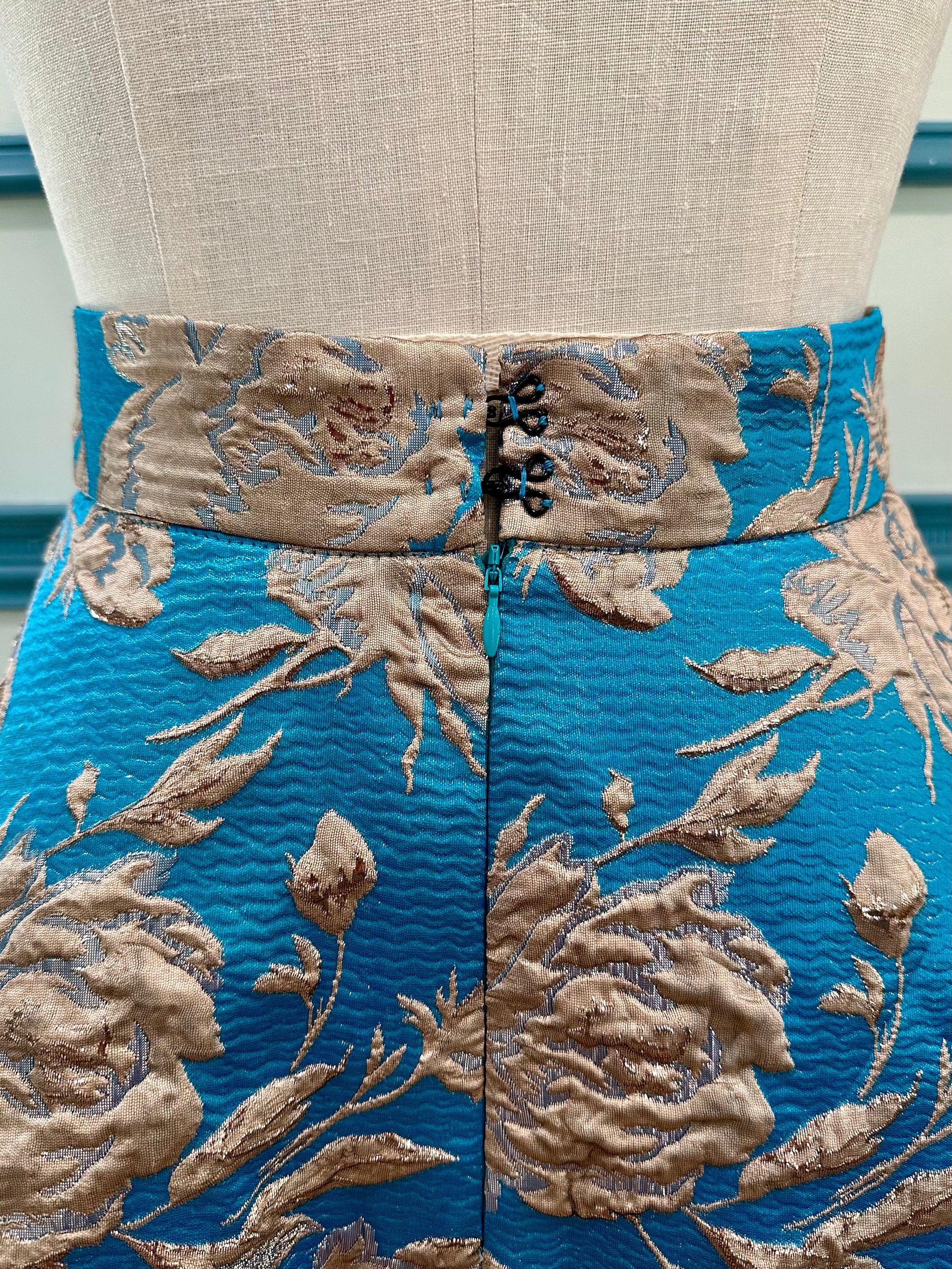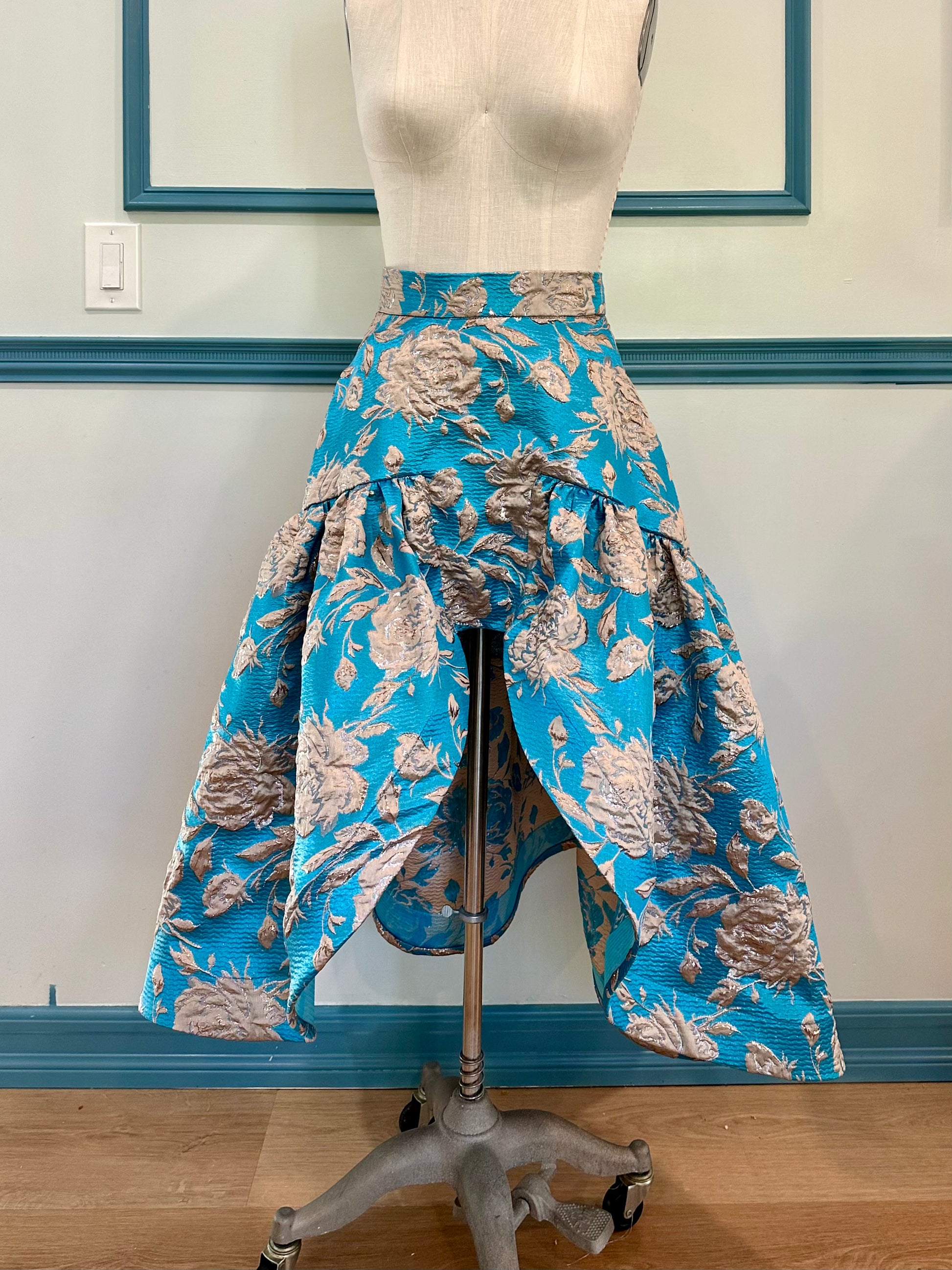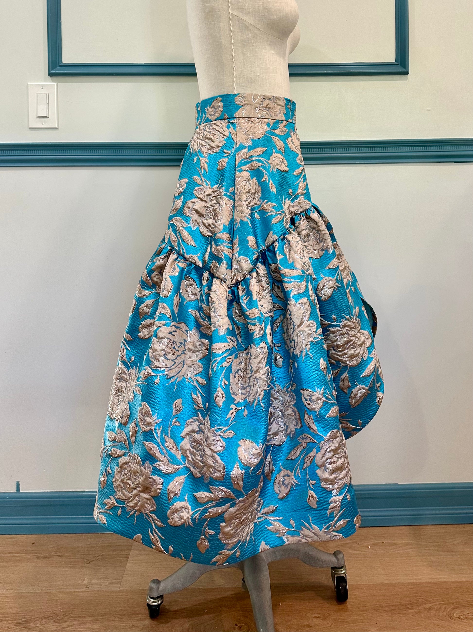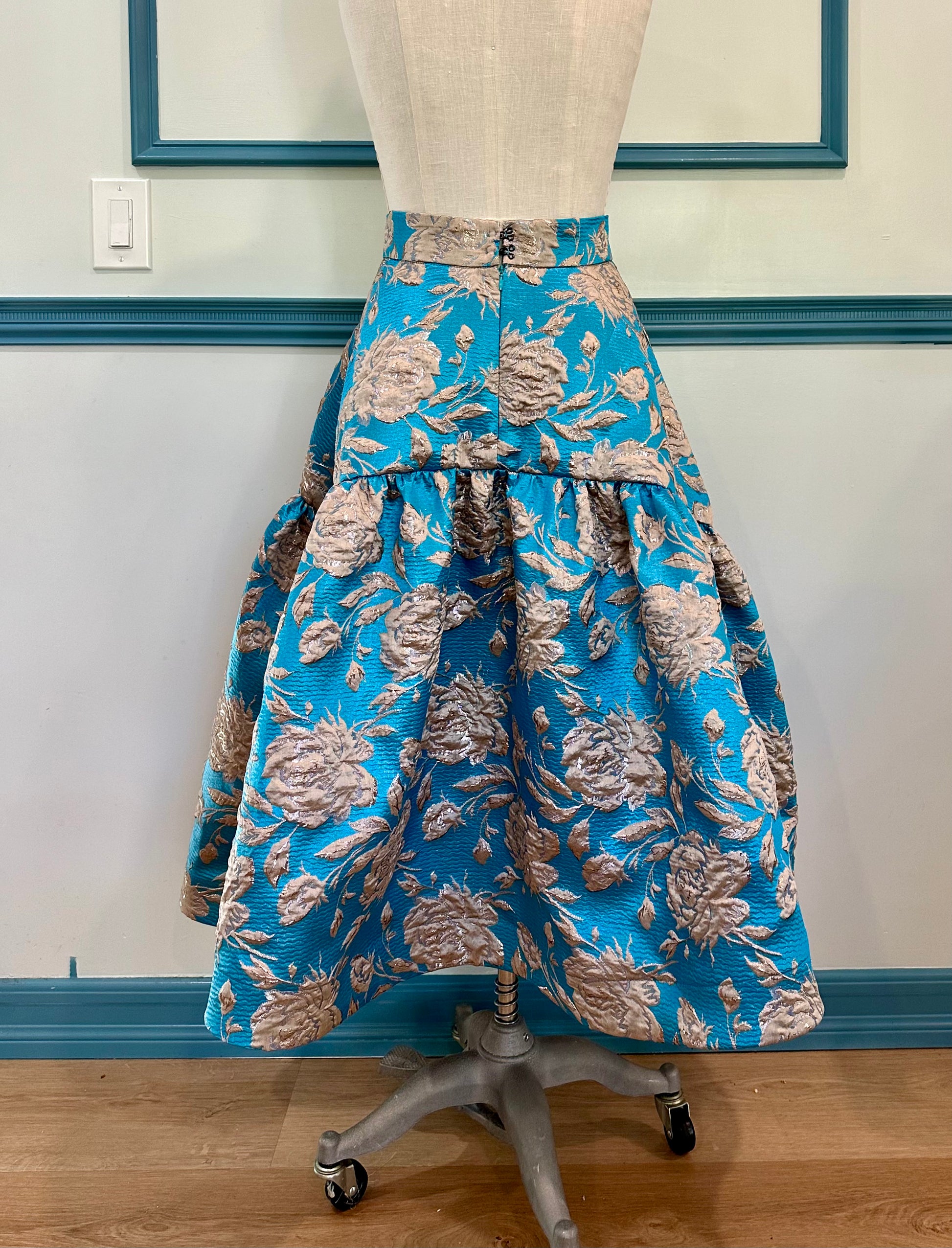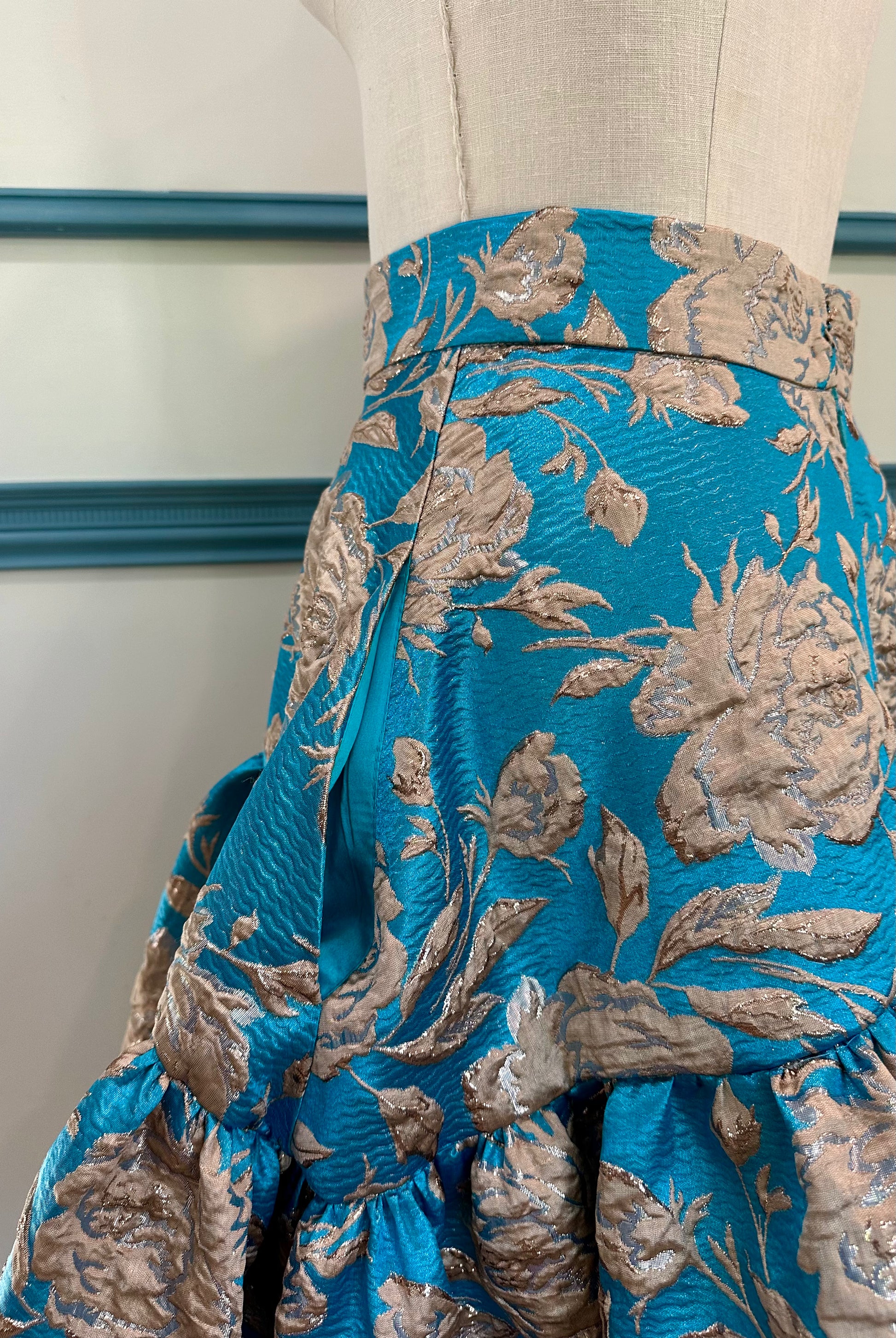 Step into the spotlight with the GINA MIDI Skirt, crafted from luxurious French brocade. This elegant skirt will ensure you capture everyone's attention. The GINA MIDI skirt has side pockets for convenience and fully lined with silk Charmause.