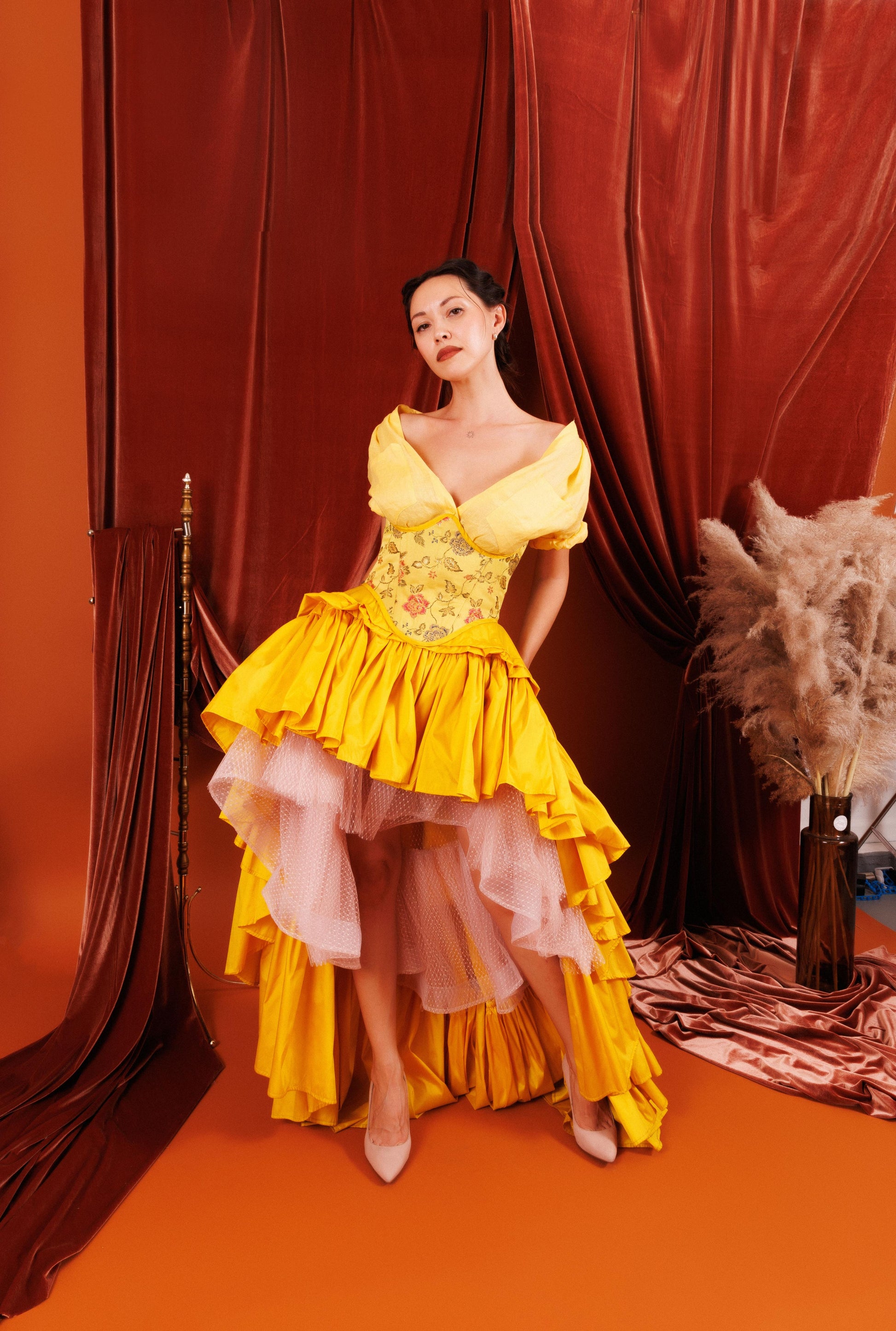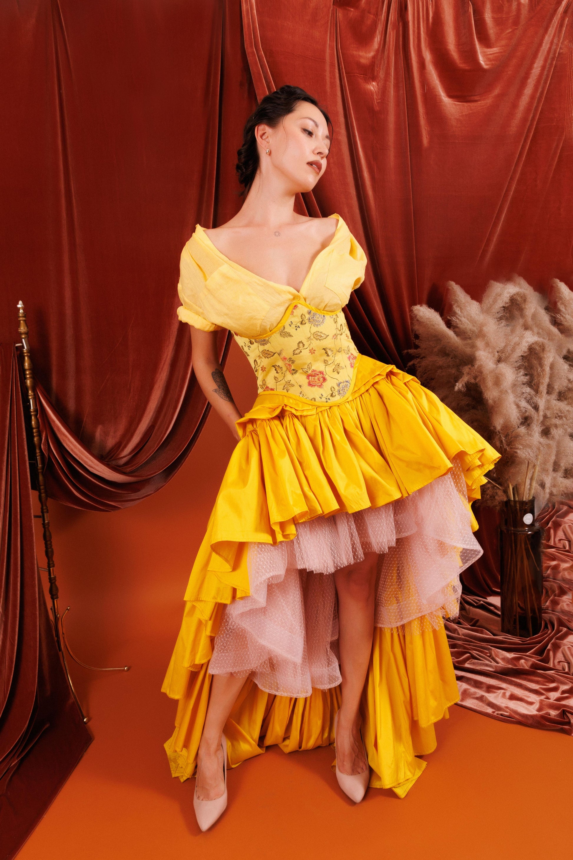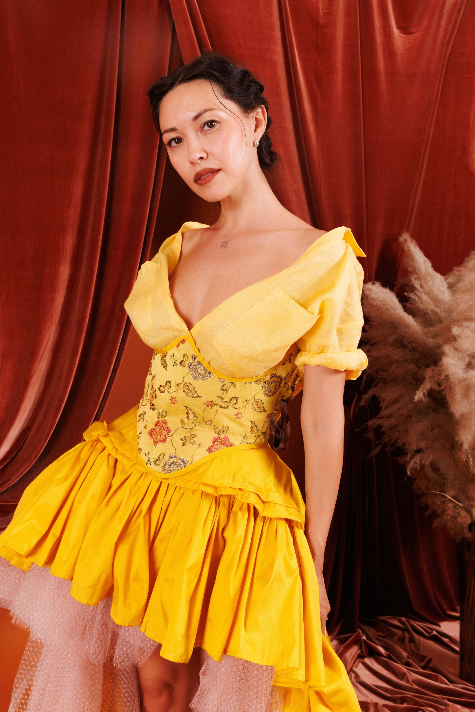 Effortlessly elegant, the Lola Underbust Corset Top is handcrafted from luxurious brocade, featuring a striking yellow base with a royal gold and red pattern. Designed to shape and define your figure, this cupless corset cinches beautifully with back lacing, creating a stunning silhouette. Perfect for adding a touch of sophistication to any outfit, the Lola Corset Top is a versatile piece that can be styled for both formal occasions and chic everyday looks.