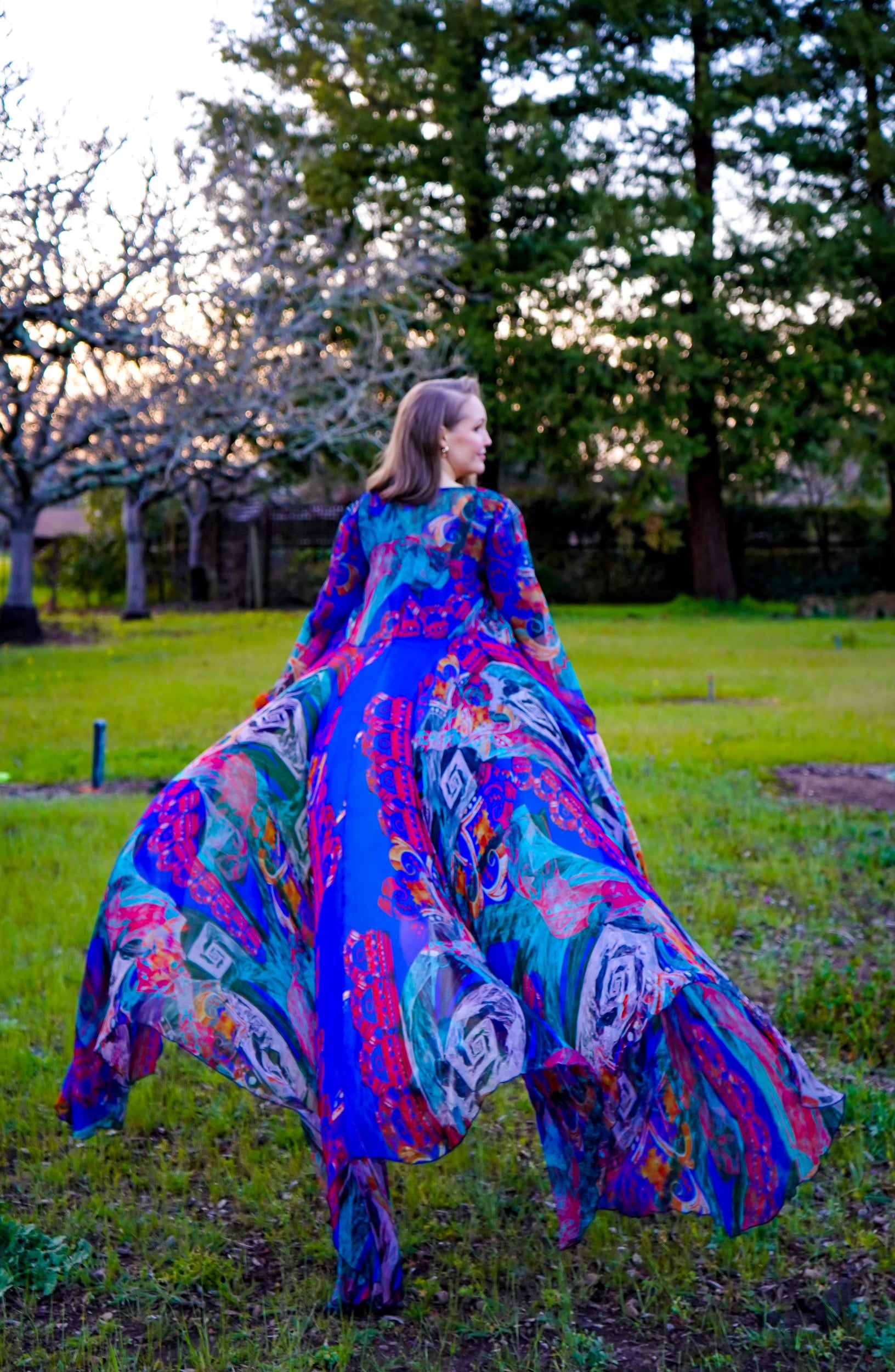 Embrace the vibrant Middle Eastern vibes with the Zurie Maxi Duster. This stunning long-sleeve duster features a beautiful multicolor design with violet and blue patterns, adding an exotic touch to your wardrobe. Made from 100% silk chiffon, it offers a luxurious and lightweight feel. Ideal for layering over any outfit, the Zurie Maxi Duster brings sophistication and a splash of color to any occasion.
