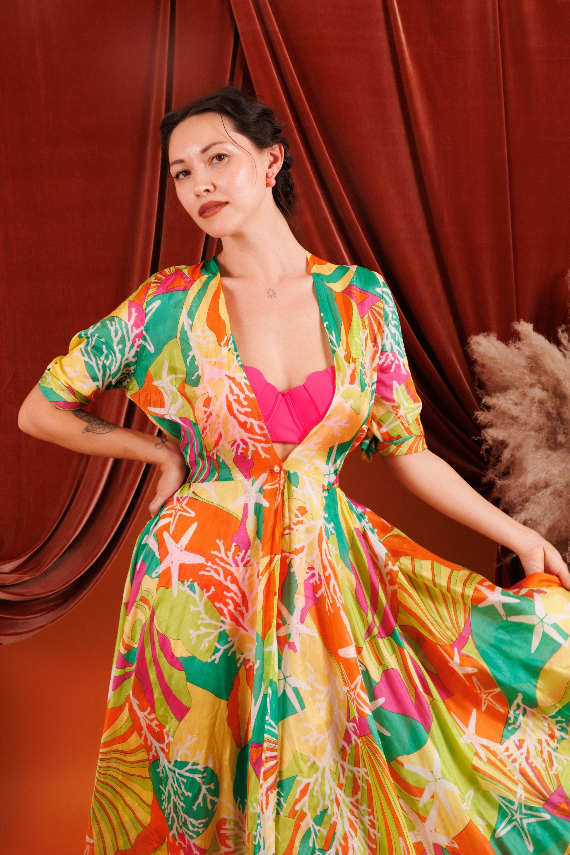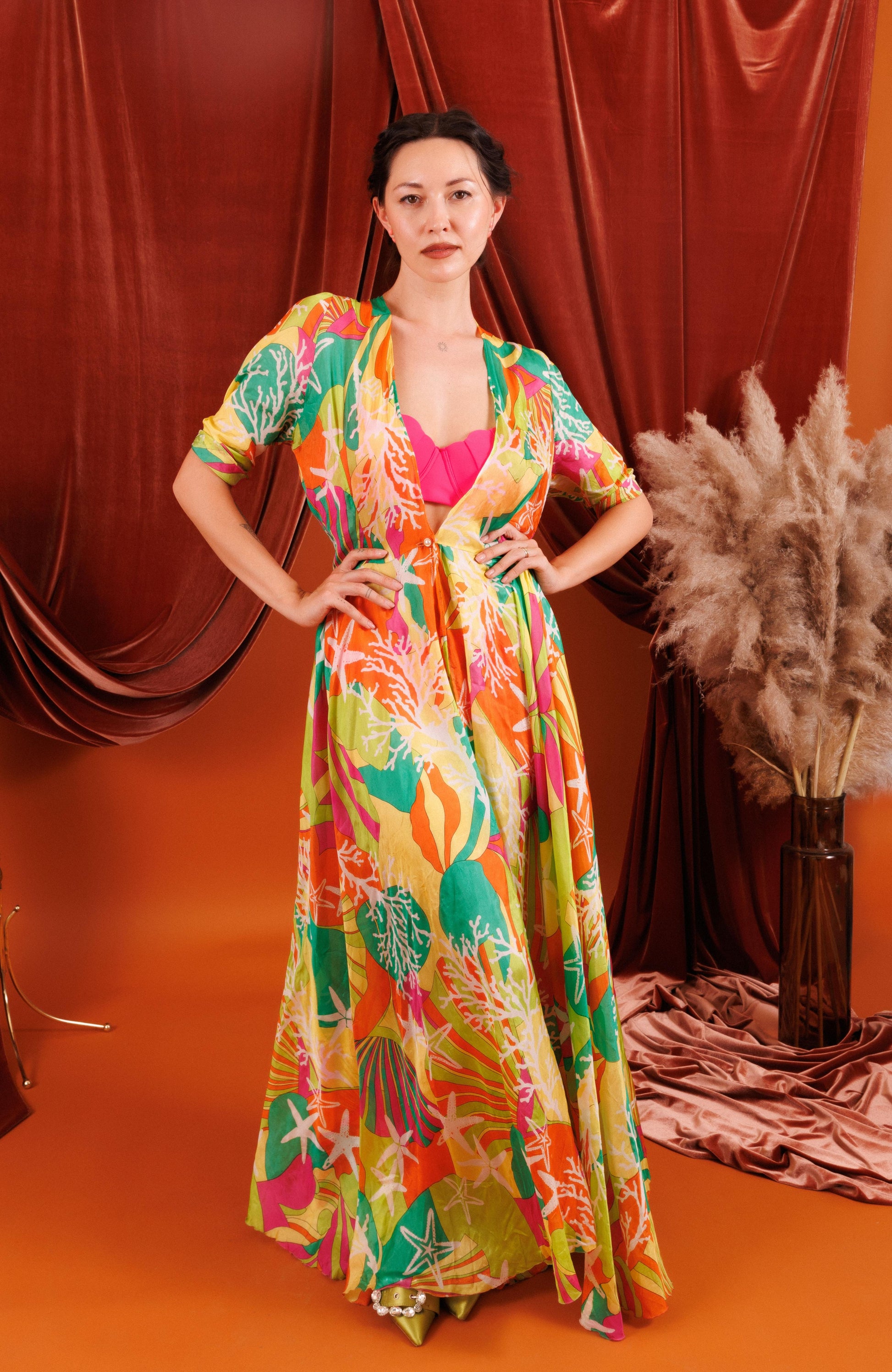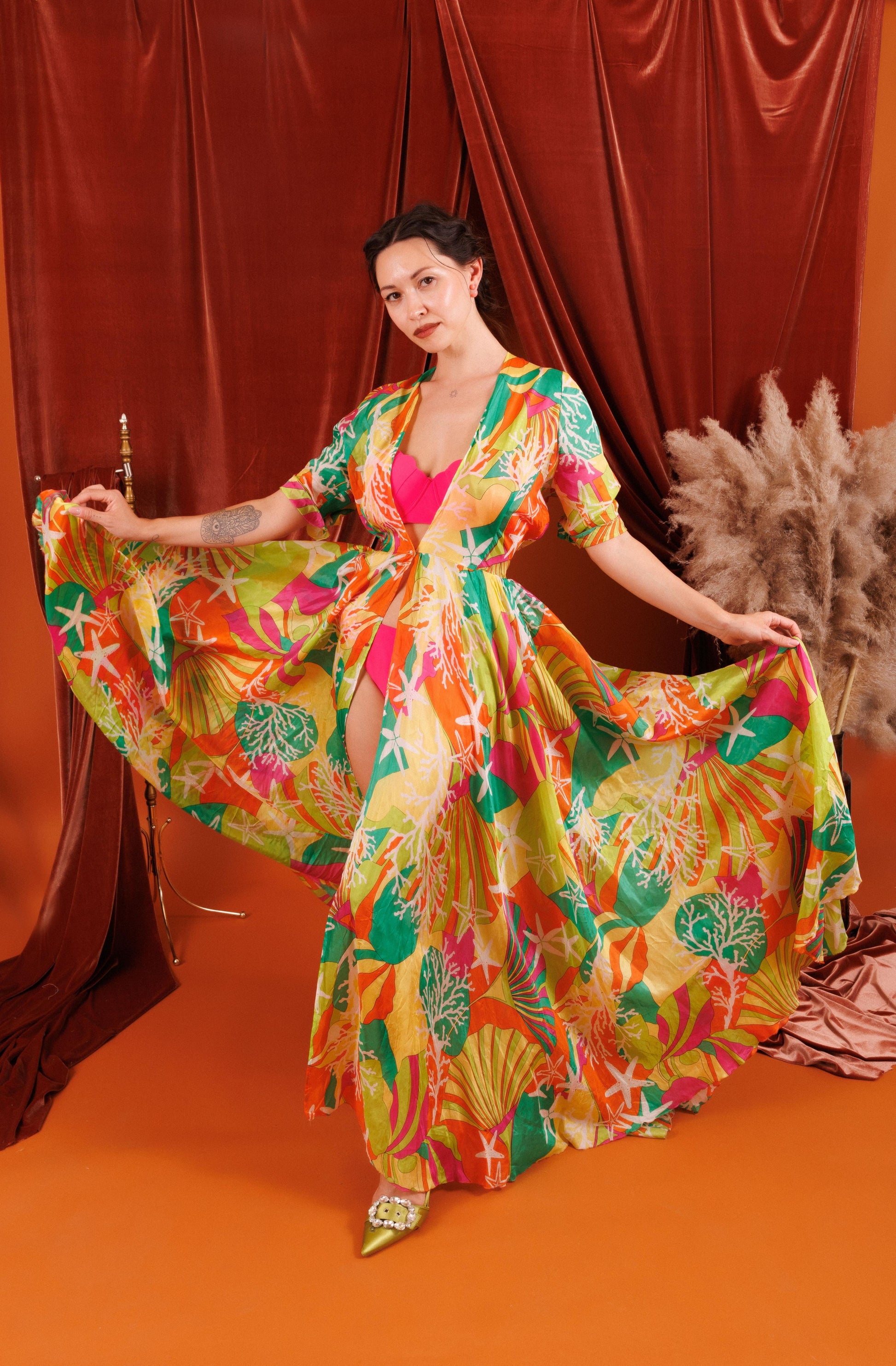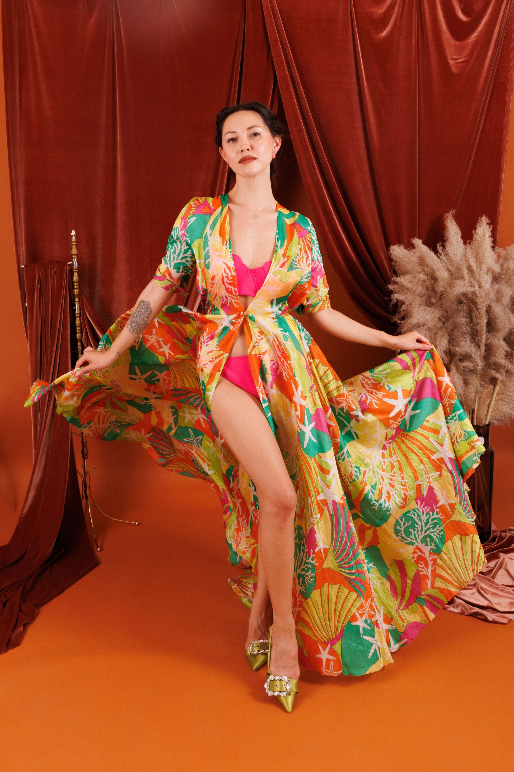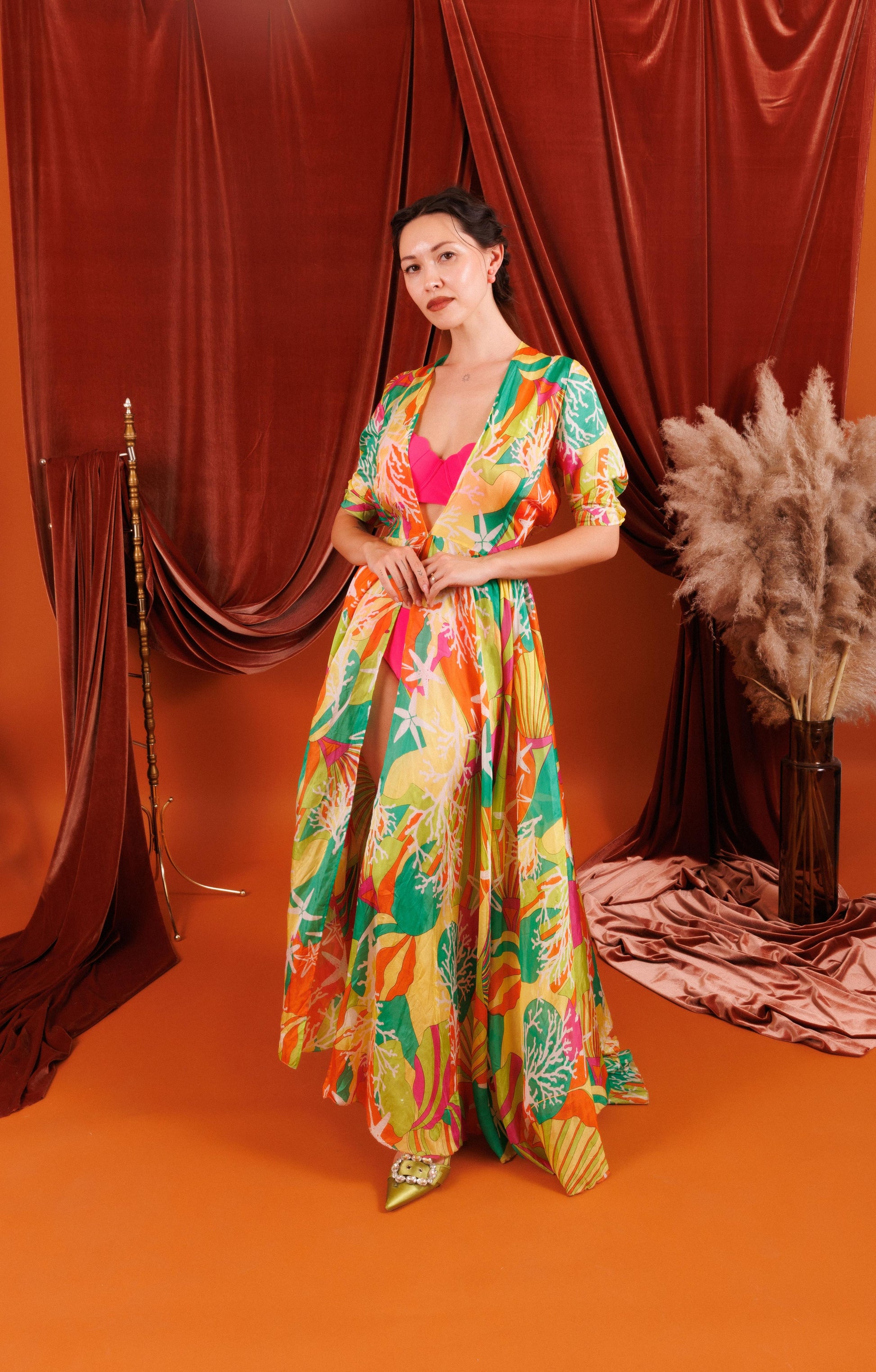 Elevate your wardrobe with the Zurie Maxi Duster, a luxurious overlay piece crafted from 100% silk chiffon. This stunning duster features a vibrant multicolor design with a tropical pattern, adding a touch of exotic elegance to your look. With its flowing silhouette, the Zurie Maxi Duster is perfect for layering over any outfit, bringing sophistication and grace to any occasion.